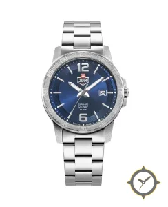 Eine Militär-Uhr mit einem markanten 50mm Auftritt am Handgelenk, gefertigt aus Edelstahl mit einem Zifferblatt in blau und einer besonderen "sunburst"-Oberfläche.
