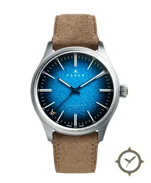 Eine Dress-Uhr mit einem 36mm Gehäuse im Vintage-Stil gefertigt aus Edelstahl mit einem Zifferblatt in blau und einer besonderen "textured/grained (hammered/sea-wave finish)"-Oberfläche.