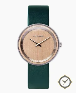 Eine Minimalistisch-Uhr mit einem 35mm Gehäuse im Vintage-Stil gefertigt aus Edelstahl mit einem Zifferblatt in braun und einer besonderen "wood (natural veneer)"-Oberfläche.