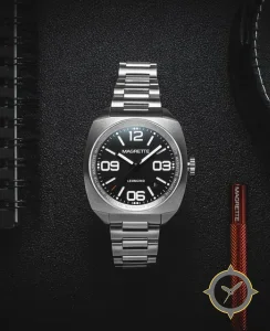 Eine Fahrer-Uhr mit einem markanten 44.5mm Auftritt am Handgelenk, gefertigt aus Edelstahl mit einem Zifferblatt in schwarz und einer besonderen "matte"-Oberfläche.