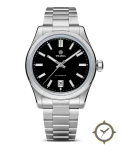Eine Sport-Uhr mit einem 37mm Gehäuse im Vintage-Stil gefertigt aus Edelstahl mit einem Zifferblatt in schwarz und einer besonderen "sunburst"-Oberfläche.