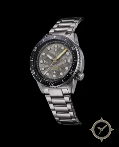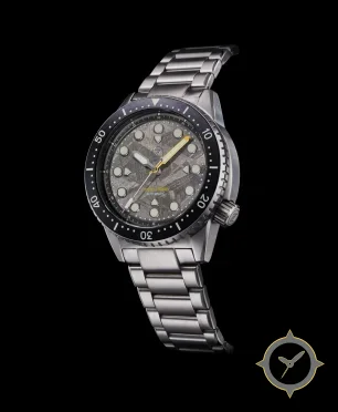 Eine Taucheruhr-Uhr mit einem markanten 45.5mm Auftritt am Handgelenk, gefertigt aus Edelstahl mit einem Zifferblatt in grau und einer besonderen "meteorite"-Oberfläche.
