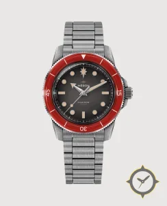 Eine Taucheruhr-Uhr mit einem 33.5mm Gehäuse im Vintage-Stil gefertigt aus Edelstahl mit einem Zifferblatt in schwarz und einer besonderen "matte gradient (fumé)"-Oberfläche.