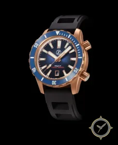 Eine Taucheruhr-Uhr mit einem vielseitigen 40mm Gehäuse, das an fast jedes Handgelenk passt, gefertigt aus Bronze mit einem Zifferblatt in blau und einer besonderen "sunburst"-Oberfläche.