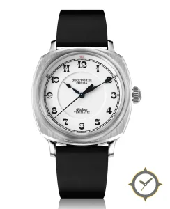Eine Dress-Uhr mit einem 37mm Gehäuse im Vintage-Stil gefertigt aus Edelstahl mit einem Zifferblatt in weiß und einer besonderen "enamel/smooth lacquer"-Oberfläche.