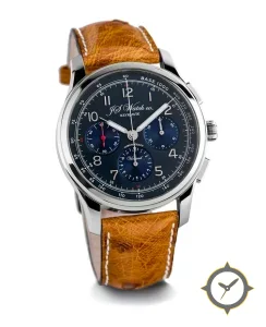 Eine Chronograph-Uhr mit einem 34mm Gehäuse im Vintage-Stil gefertigt aus Edelstahl mit einem Zifferblatt in marineblau und einer besonderen "sunburst"-Oberfläche.