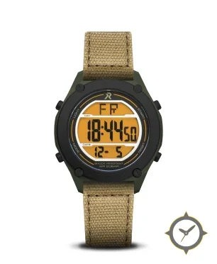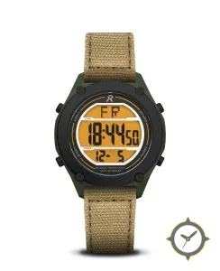 Eine Digital-Uhr mit einem markanten 46.5mm Auftritt am Handgelenk, gefertigt aus Titan mit einem Zifferblatt in orange und einer besonderen "segmented-lcd"-Oberfläche.