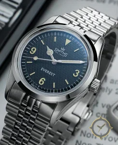 Eine Field-Uhr mit einem 35.5mm Gehäuse im Vintage-Stil gefertigt aus Edelstahl mit einem Zifferblatt in schwarz und einer besonderen "textured waffle / hobnail"-Oberfläche.