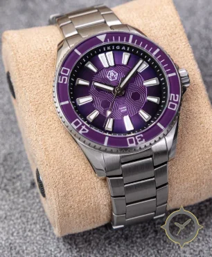 Eine Taucheruhr-Uhr gefertigt aus Edelstahl mit einem Zifferblatt in lila und einer besonderen "sunburst with central geometric (hexagonal) guilloché"-Oberfläche.