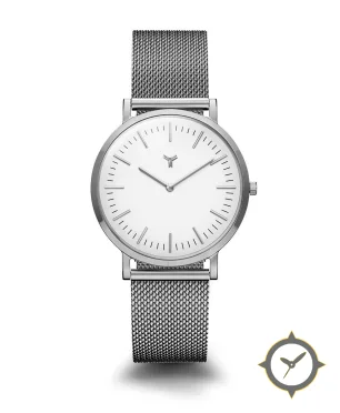 Eine Minimalistisch-Uhr mit einem vielseitigen 40mm Gehäuse, das an fast jedes Handgelenk passt, gefertigt aus Edelstahl mit einem Zifferblatt in weiß und einer besonderen "matte"-Oberfläche.