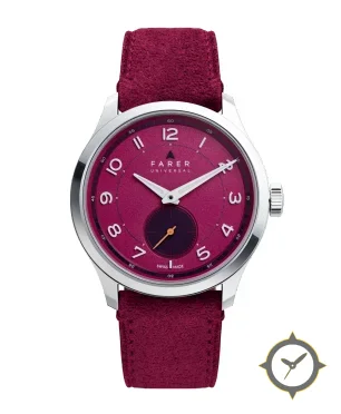 Eine Dress-Uhr mit einem 33.5mm Gehäuse im Vintage-Stil gefertigt aus Edelstahl mit einem Zifferblatt in lila und einer besonderen "textured (fine grain / sandblasted)"-Oberfläche.