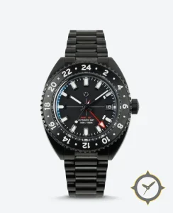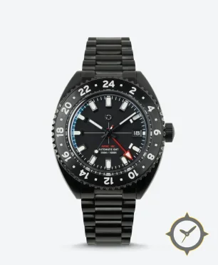 Eine GMT-Uhr mit einem markanten 43.5mm Auftritt am Handgelenk, gefertigt aus Edelstahl mit einem Zifferblatt in schwarz und einer besonderen "matte"-Oberfläche und einer echten GMT-Funktion, mit der du eine zweite Zeitzone verfolgen kannst.