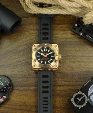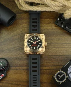 Eine Taucheruhr-Uhr mit einem vielseitigen 41mm Gehäuse, das an fast jedes Handgelenk passt, gefertigt aus Bronze mit einem Zifferblatt in schwarz und einer besonderen "matte"-Oberfläche.