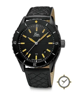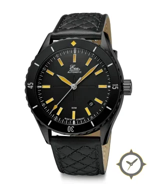 Eine Taucheruhr-Uhr mit einem markanten 46mm Auftritt am Handgelenk, gefertigt aus Edelstahl mit einem Zifferblatt in schwarz und einer besonderen "matte"-Oberfläche.
