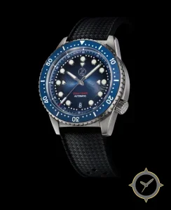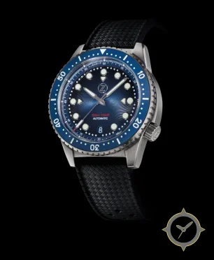 Eine Taucheruhr-Uhr mit einem markanten 43.5mm Auftritt am Handgelenk, gefertigt aus Edelstahl mit einem Zifferblatt in blau und einer besonderen "sunburst with radial wave guilloché"-Oberfläche.