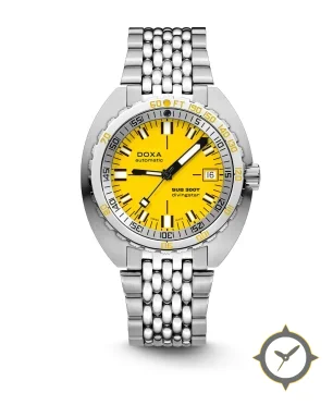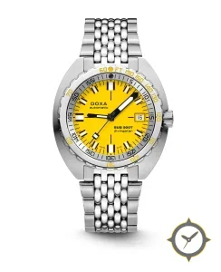 Eine Taucheruhr-Uhr mit einem vielseitigen 39.5mm Gehäuse, das an fast jedes Handgelenk passt, gefertigt aus Edelstahl mit einem Zifferblatt in gelb und einer besonderen "matte"-Oberfläche.