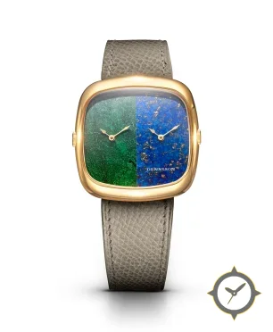 Eine Dress-Uhr mit einem 30mm Gehäuse im Vintage-Stil gefertigt aus Gold mit einem Zifferblatt in blau und einer besonderen "natural stone (lapis/malachite mix) with visible gold flecks"-Oberfläche.