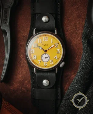 Eine Vintage-Uhr mit einem 37.5mm Gehäuse im Vintage-Stil gefertigt aus Bronze mit einem Zifferblatt in gelb und einer besonderen "matte enamel"-Oberfläche.