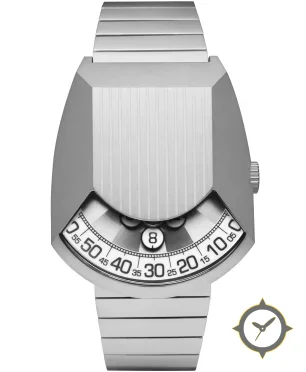 Eine Digital-Uhr mit einem vielseitigen 41mm Gehäuse, das an fast jedes Handgelenk passt, gefertigt aus Edelstahl mit einem Zifferblatt in silber und einer besonderen "vertical brushed stripes with sunburst sectors near the minute arc"-Oberfläche.