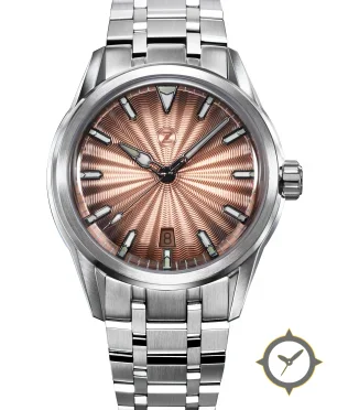 Eine Dress-Uhr mit einem 33mm Gehäuse im Vintage-Stil gefertigt aus Edelstahl mit einem Zifferblatt in braun und einer besonderen "radial guilloché (wavy sunburst)"-Oberfläche.