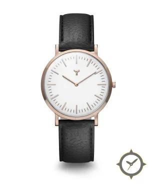Eine Minimalistisch-Uhr mit einem 37mm Gehäuse im Vintage-Stil gefertigt aus Gold mit einem Zifferblatt in weiß und einer besonderen "smooth"-Oberfläche.