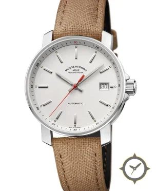 Eine Field-Uhr mit einem vielseitigen 40.5mm Gehäuse, das an fast jedes Handgelenk passt, gefertigt aus Edelstahl mit einem Zifferblatt in weiß und einer besonderen "matte"-Oberfläche.
