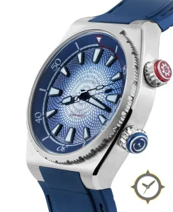 Eine Taucheruhr-Uhr mit einem markanten 41.5mm Auftritt am Handgelenk, gefertigt aus Edelstahl mit einem Zifferblatt in blau und einer besonderen "guilloche (radial engine-turned)"-Oberfläche.