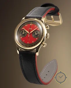 Eine Chronograph-Uhr mit einem 31mm Gehäuse im Vintage-Stil gefertigt aus Gold mit einem Zifferblatt in rot und einer besonderen "matte"-Oberfläche.