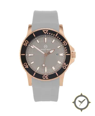 Eine Taucheruhr-Uhr mit einem 33.5mm Gehäuse im Vintage-Stil gefertigt aus Gold mit einem Zifferblatt in grau und einer besonderen "matte"-Oberfläche.