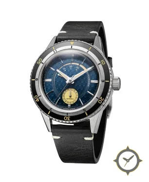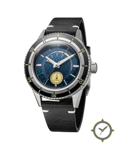 Eine Taucheruhr-Uhr mit einem vielseitigen 38.5mm Gehäuse, das an fast jedes Handgelenk passt, gefertigt aus Edelstahl mit einem Zifferblatt in blau und einer besonderen "textured guilloche / scale pattern"-Oberfläche und einer praktischen Gangreserveanzeige.