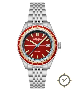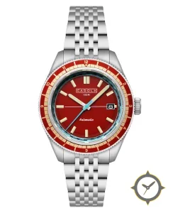 Eine Taucheruhr-Uhr mit einem markanten 44mm Auftritt am Handgelenk, gefertigt aus Edelstahl mit einem Zifferblatt in rot und einer besonderen "matte"-Oberfläche.