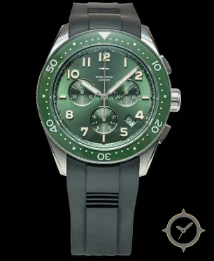 Eine Chronograph-Uhr mit einem markanten 41.5mm Auftritt am Handgelenk, gefertigt aus Edelstahl mit einem Zifferblatt in grün und einer besonderen "sunburst"-Oberfläche.
