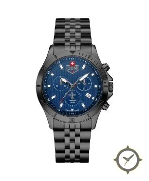 Eine Chronograph-Uhr mit einem markanten 46.5mm Auftritt am Handgelenk, gefertigt aus Edelstahl mit einem Zifferblatt in blau und einer besonderen "vertical striped/grain texture"-Oberfläche.