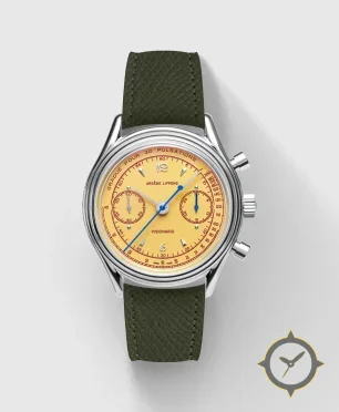 Eine Chronograph-Uhr mit einem markanten 47.5mm Auftritt am Handgelenk, gefertigt aus Edelstahl mit einem Zifferblatt in gelb und einer besonderen "lacquer"-Oberfläche.