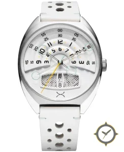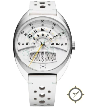 Eine Racing-Uhr mit einem vielseitigen 39.5mm Gehäuse, das an fast jedes Handgelenk passt, gefertigt aus Edelstahl mit einem Zifferblatt in weiß und einer besonderen "layered concentric levels with a perforated grille inset"-Oberfläche.