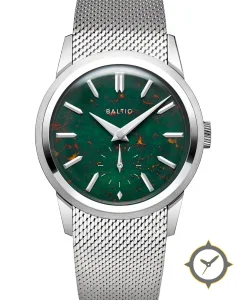 Eine Dress-Uhr mit einem vielseitigen 40.5mm Gehäuse, das an fast jedes Handgelenk passt, gefertigt aus Edelstahl mit einem Zifferblatt in grün und einer besonderen "marbled/stone-like finish"-Oberfläche.