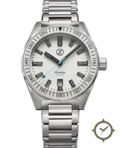 Eine Taucheruhr-Uhr mit einem markanten 42.5mm Auftritt am Handgelenk, gefertigt aus Edelstahl mit einem Zifferblatt in weiß und einer besonderen "matte"-Oberfläche.