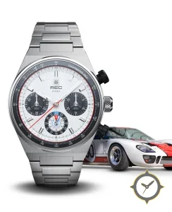 Eine Chronograph-Uhr mit einem vielseitigen 41mm Gehäuse, das an fast jedes Handgelenk passt, gefertigt aus Edelstahl mit einem Zifferblatt in weiß und einer besonderen "lacquered"-Oberfläche und einer echten GMT-Funktion, mit der du eine zweite Zeitzone verfolgen kannst.