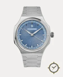 Eine Luxus-Uhr mit einem markanten 43.5mm Auftritt am Handgelenk, gefertigt aus Edelstahl mit einem Zifferblatt in blau und einer besonderen "guilloché (spiral/wave)"-Oberfläche.