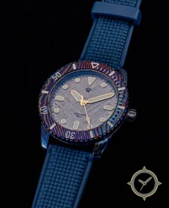 Eine Taucheruhr-Uhr mit einem markanten 45mm Auftritt am Handgelenk, gefertigt aus Edelstahl mit einem Zifferblatt in grau und einer besonderen "Widmanstätten / meteorite texture"-Oberfläche.