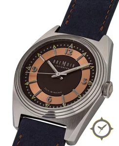 Eine Vintage-Uhr mit einem vielseitigen 40.5mm Gehäuse, das an fast jedes Handgelenk passt, gefertigt aus Edelstahl mit einem Zifferblatt in braun und einer besonderen "matte center with brushed/circular sunburst copper ring"-Oberfläche.