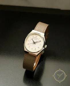 Eine Dress-Uhr mit einem 37mm Gehäuse im Vintage-Stil gefertigt aus Edelstahl mit einem Zifferblatt in weiß und einer besonderen "matte"-Oberfläche.