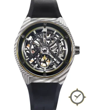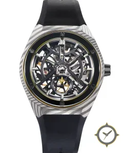 Eine Skelett-Uhr mit einem markanten 47.5mm Auftritt am Handgelenk, gefertigt aus Titan mit einem Zifferblatt in schwarz und einer besonderen "open-worked/skeleton"-Oberfläche.