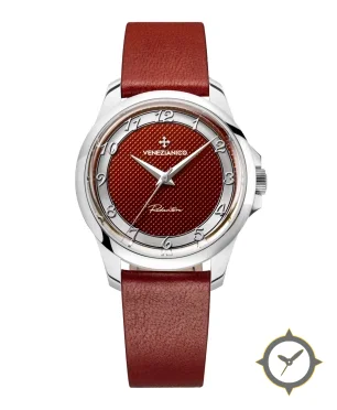 Eine Dress-Uhr mit einem markanten 42mm Auftritt am Handgelenk, gefertigt aus Edelstahl mit einem Zifferblatt in rot und einer besonderen "hobnail / textured guilloché"-Oberfläche.