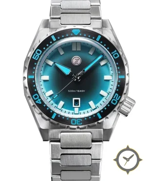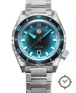 Eine Taucheruhr-Uhr mit einem markanten 50.5mm Auftritt am Handgelenk, gefertigt aus Edelstahl mit einem Zifferblatt in türkis und einer besonderen "sunburst"-Oberfläche.