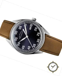 Eine Pilot-Uhr mit einem 35.5mm Gehäuse im Vintage-Stil gefertigt aus Edelstahl mit einem Zifferblatt in blau und einer besonderen "sunburst"-Oberfläche.