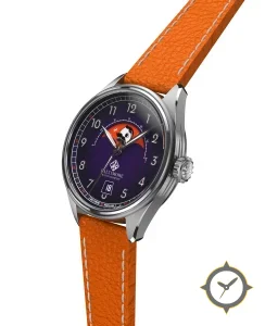 Eine Dress-Uhr mit einem 37mm Gehäuse im Vintage-Stil gefertigt aus Edelstahl mit einem Zifferblatt in lila und einer besonderen "lacquer"-Oberfläche und einer wunderschönen Mondphasenanzeige.