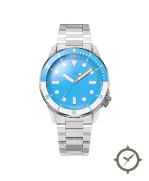 Eine Taucheruhr-Uhr mit einem 35.5mm Gehäuse im Vintage-Stil gefertigt aus Edelstahl mit einem Zifferblatt in blau und einer besonderen "sunburst"-Oberfläche.