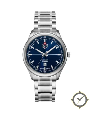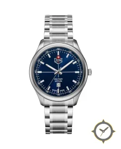 Eine Militär-Uhr mit einem vielseitigen 38.5mm Gehäuse, das an fast jedes Handgelenk passt, gefertigt aus Edelstahl mit einem Zifferblatt in marineblau und einer besonderen "sunburst"-Oberfläche.
