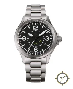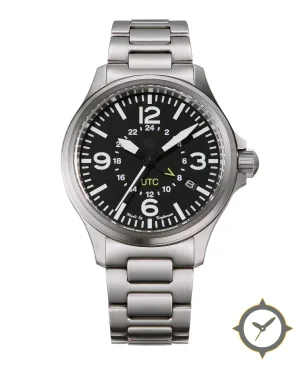 Eine GMT-Uhr mit einem 33.5mm Gehäuse im Vintage-Stil gefertigt aus Edelstahl mit einem Zifferblatt in schwarz und einer besonderen "matte"-Oberfläche und einer echten GMT-Funktion, mit der du eine zweite Zeitzone verfolgen kannst.
